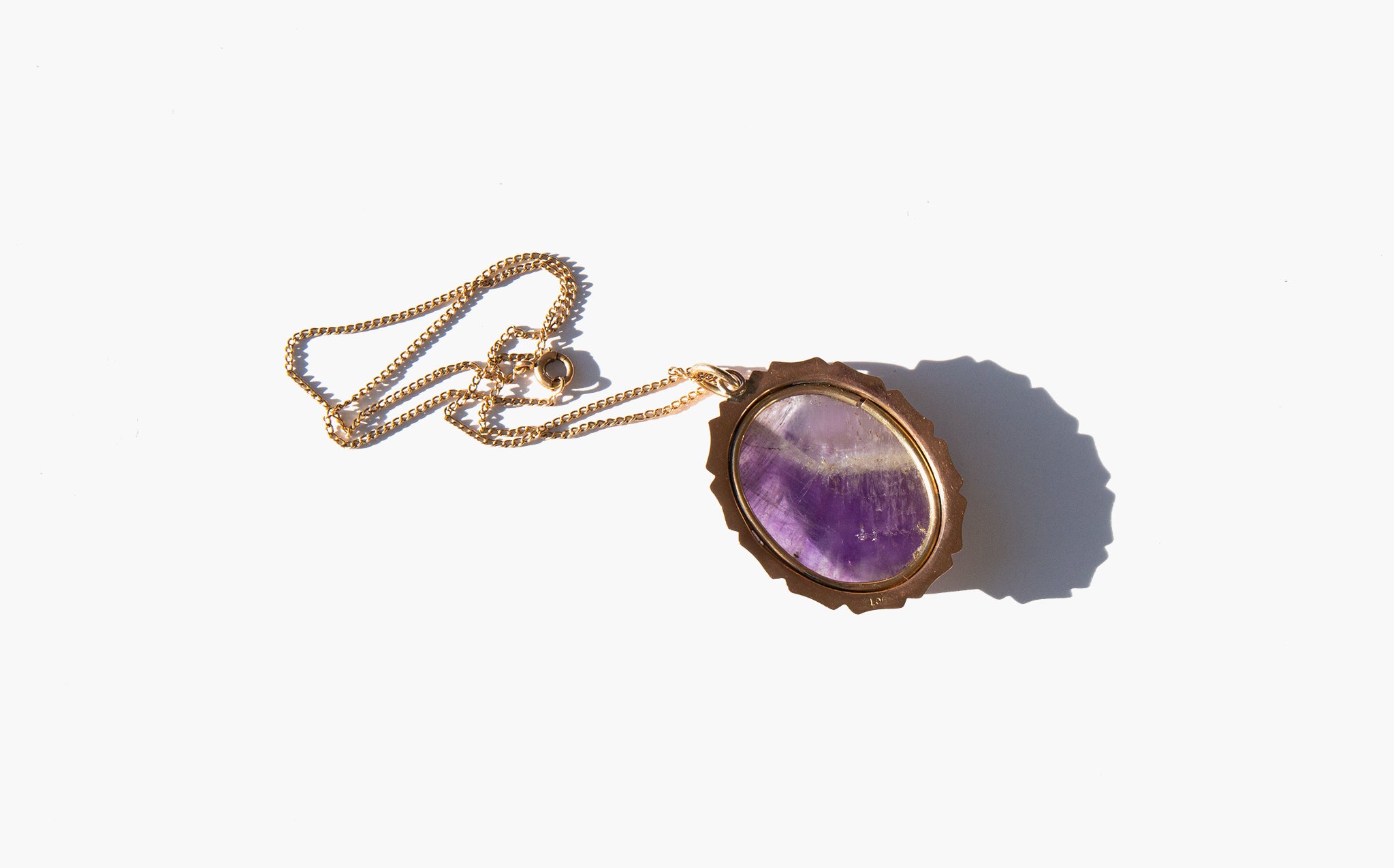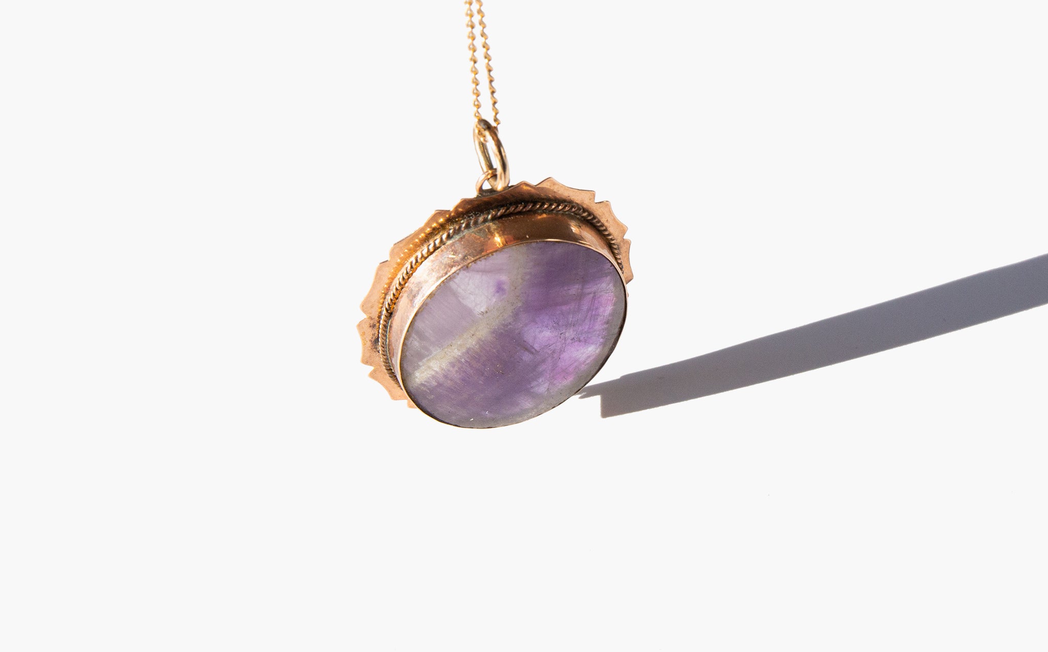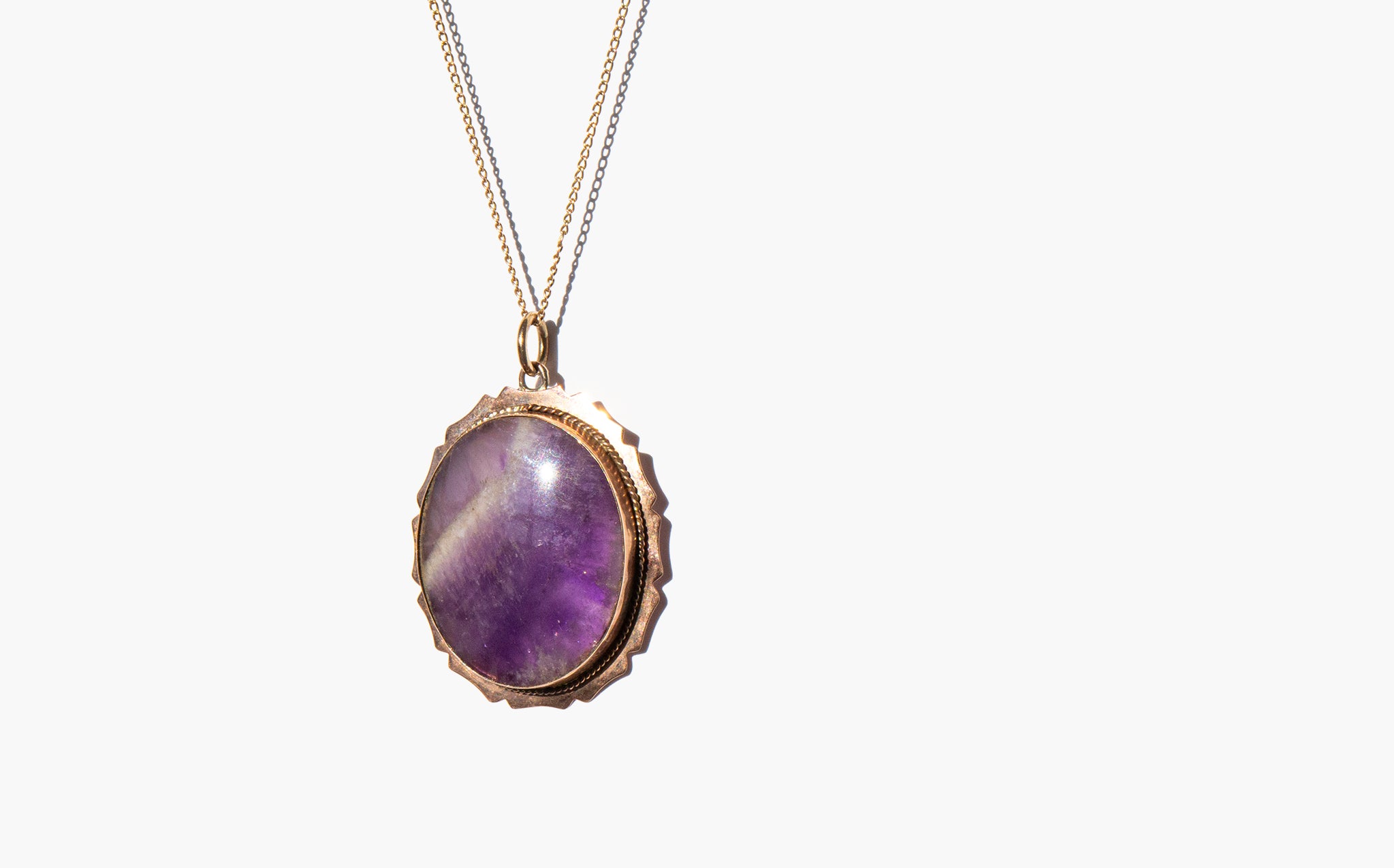 Large and stunning violet hued amethyst set in 9k peach gold on a 14k gold link chain. Amethyst has been known throughout the centuries as a symbol of purity and spirituality, an amulet of protection against evil, and as a talisman of success and wealth.