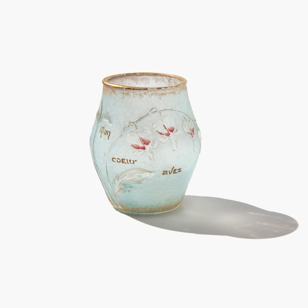 French, early 20th century Mon Coeur Avez miniature Bleeding Hearts Vase with enamel detailing. The French inscription reads "You Have My Heart."