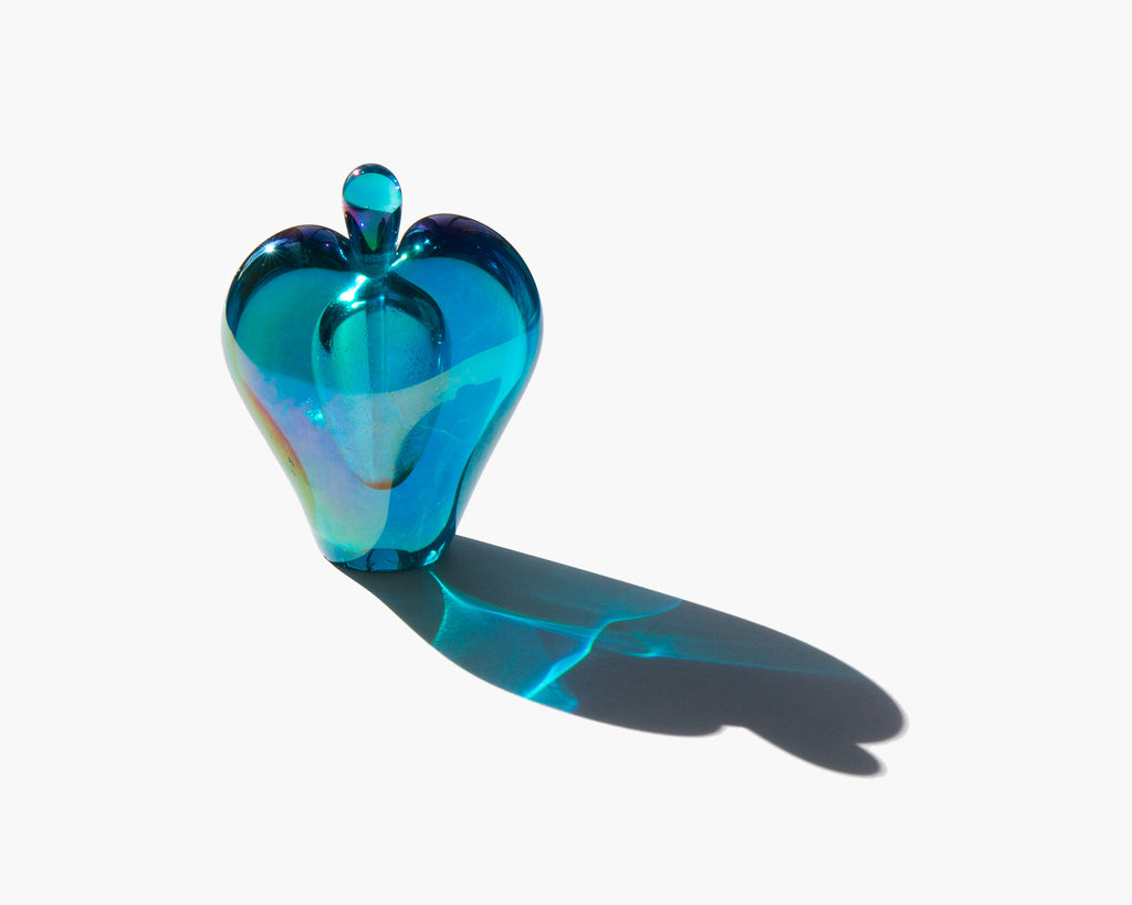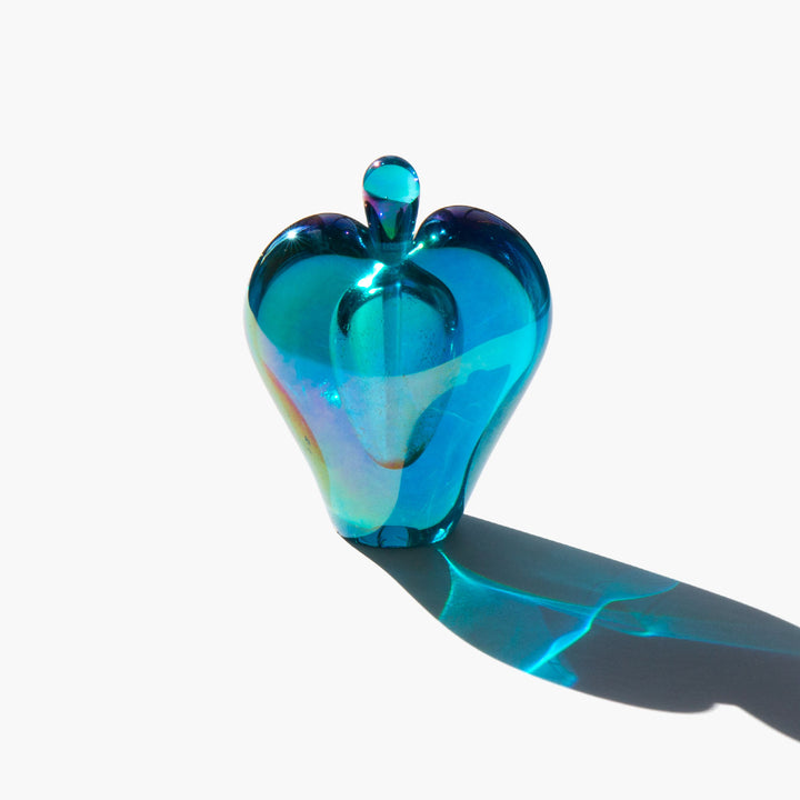 Jewel-toned, iridescent art glass heart shaped perfume bottle.