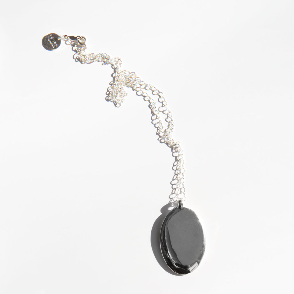 Hand fabricated, dramatic, sterling silver pendant strung on a delicate silver chain.