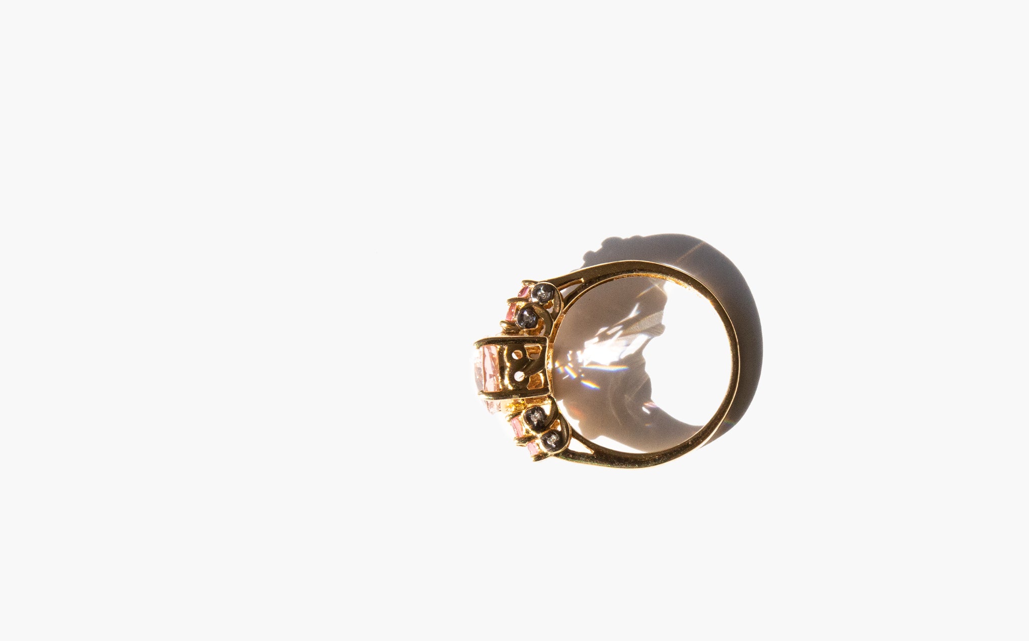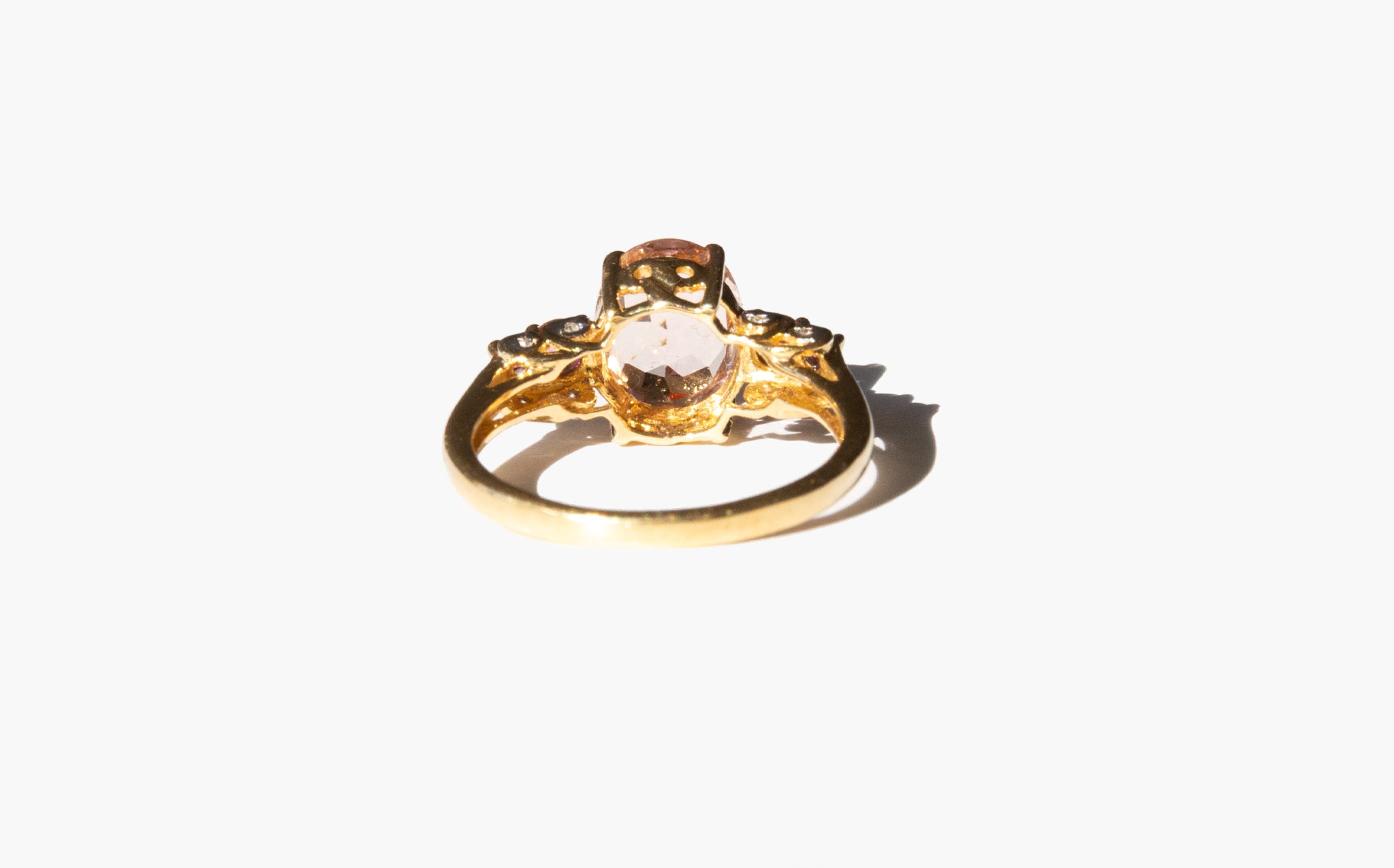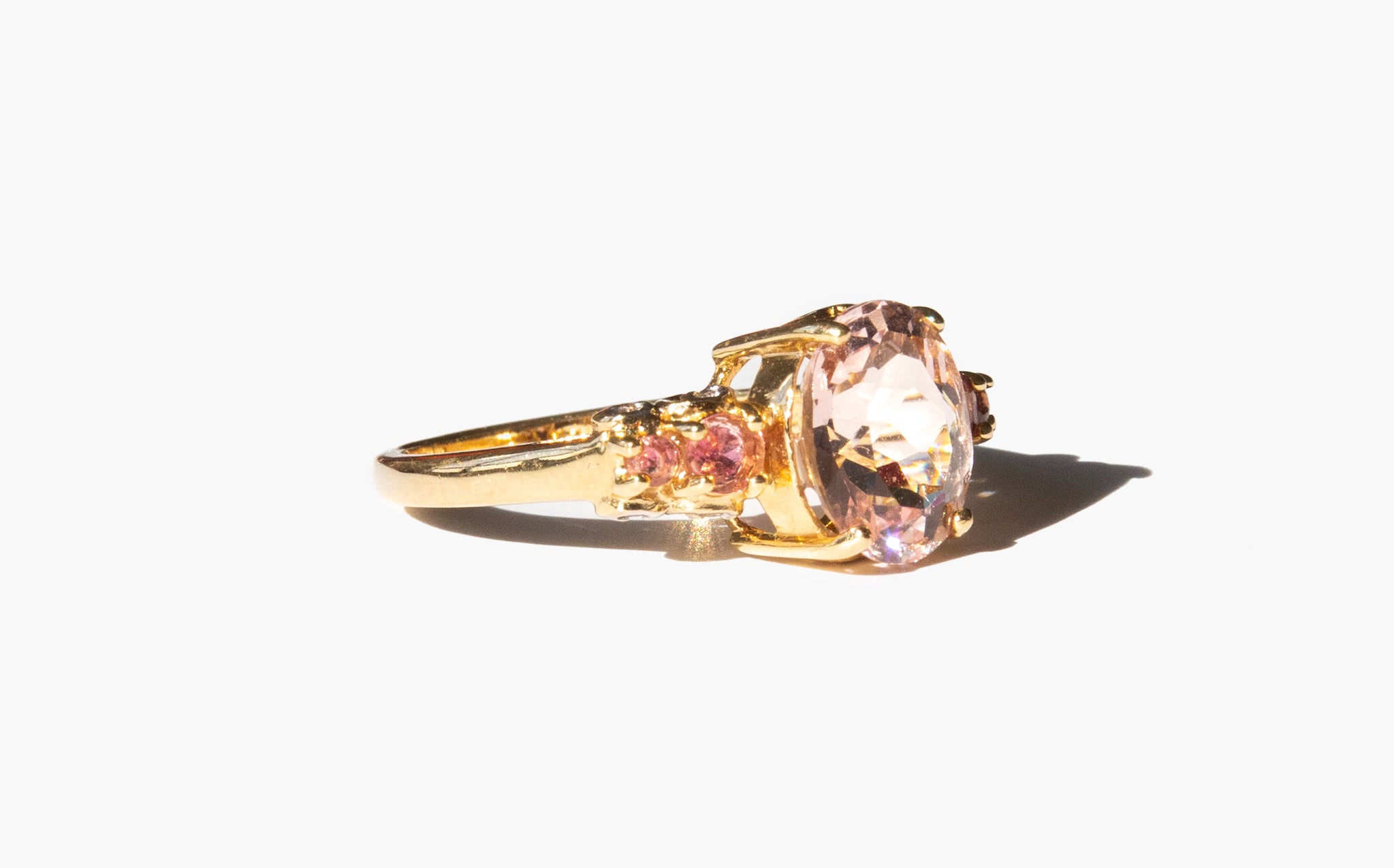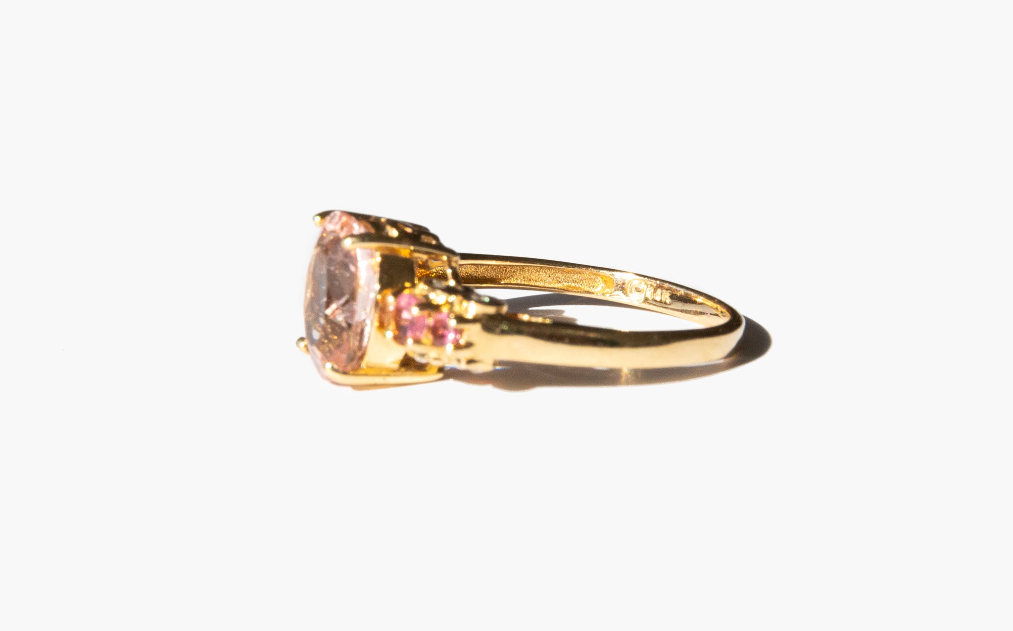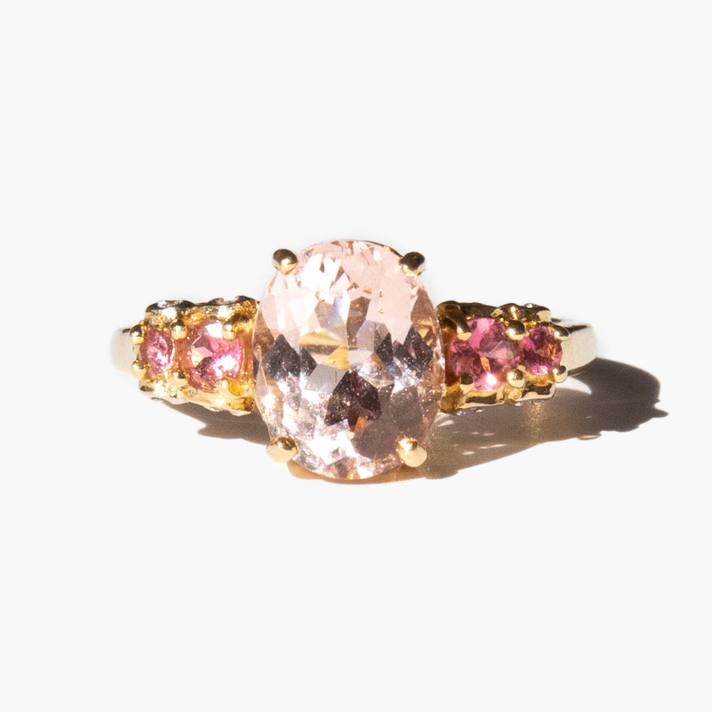 Enchanting 14k gold ring set with pink tourmaline stones in shades of pale spun sugar. Pink tourmaline is known to be calming, soothing, and closely associated with matters of the heart. Said to stimulate feelings of love, joy, and happiness, it is a stone of pleasure thought to also increase vitality and inner strength.