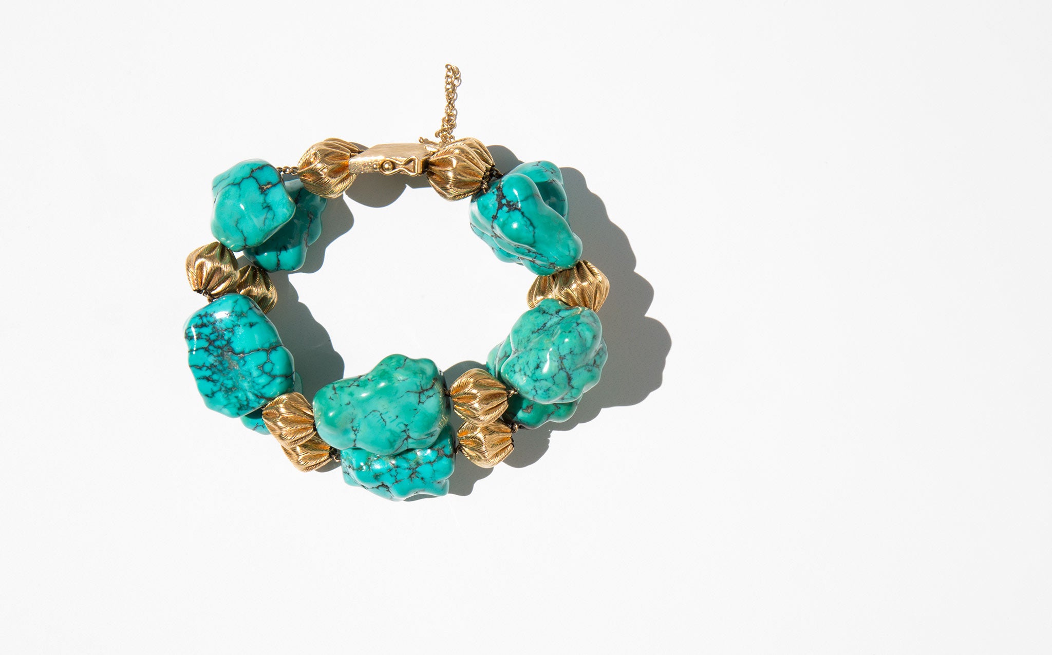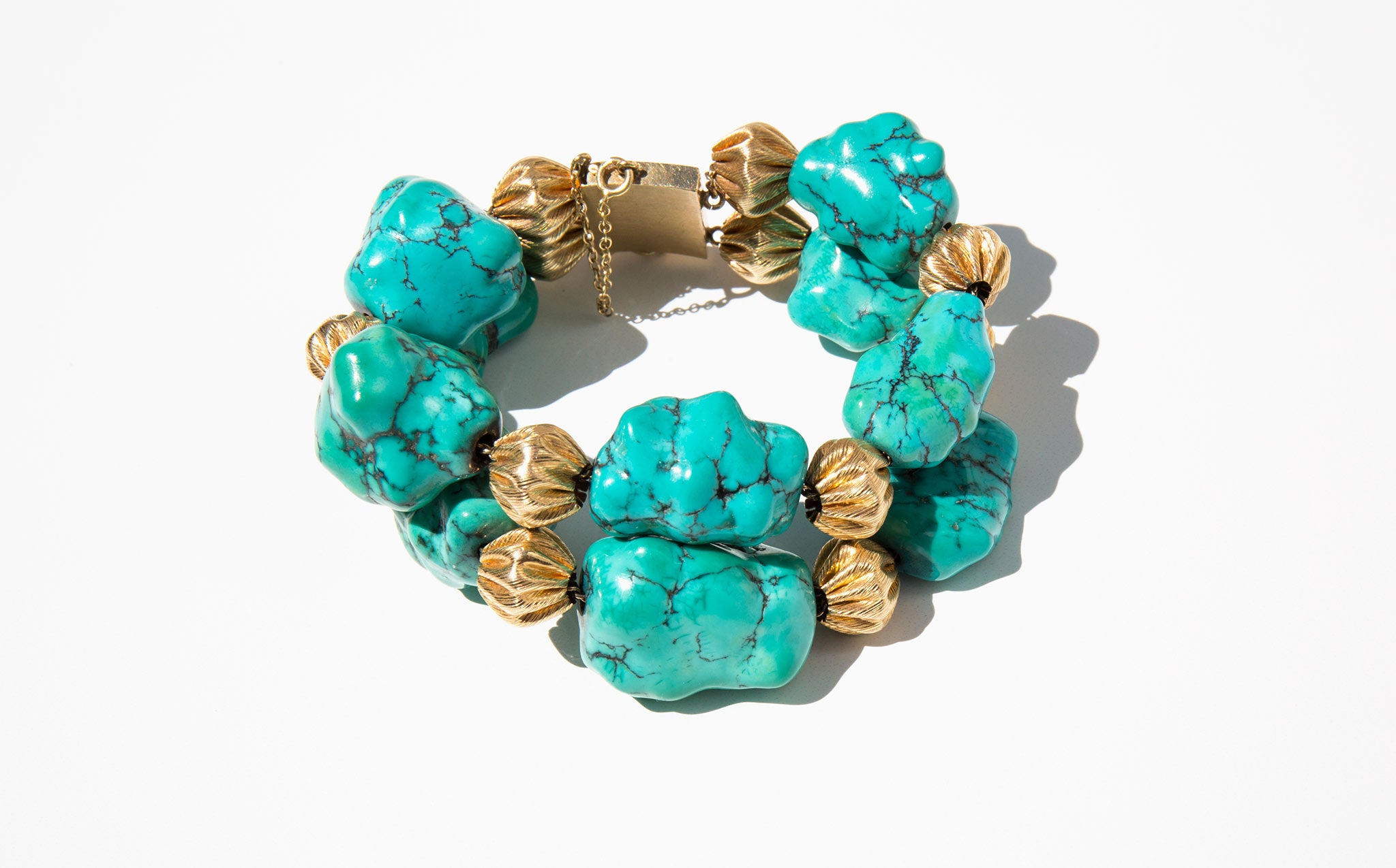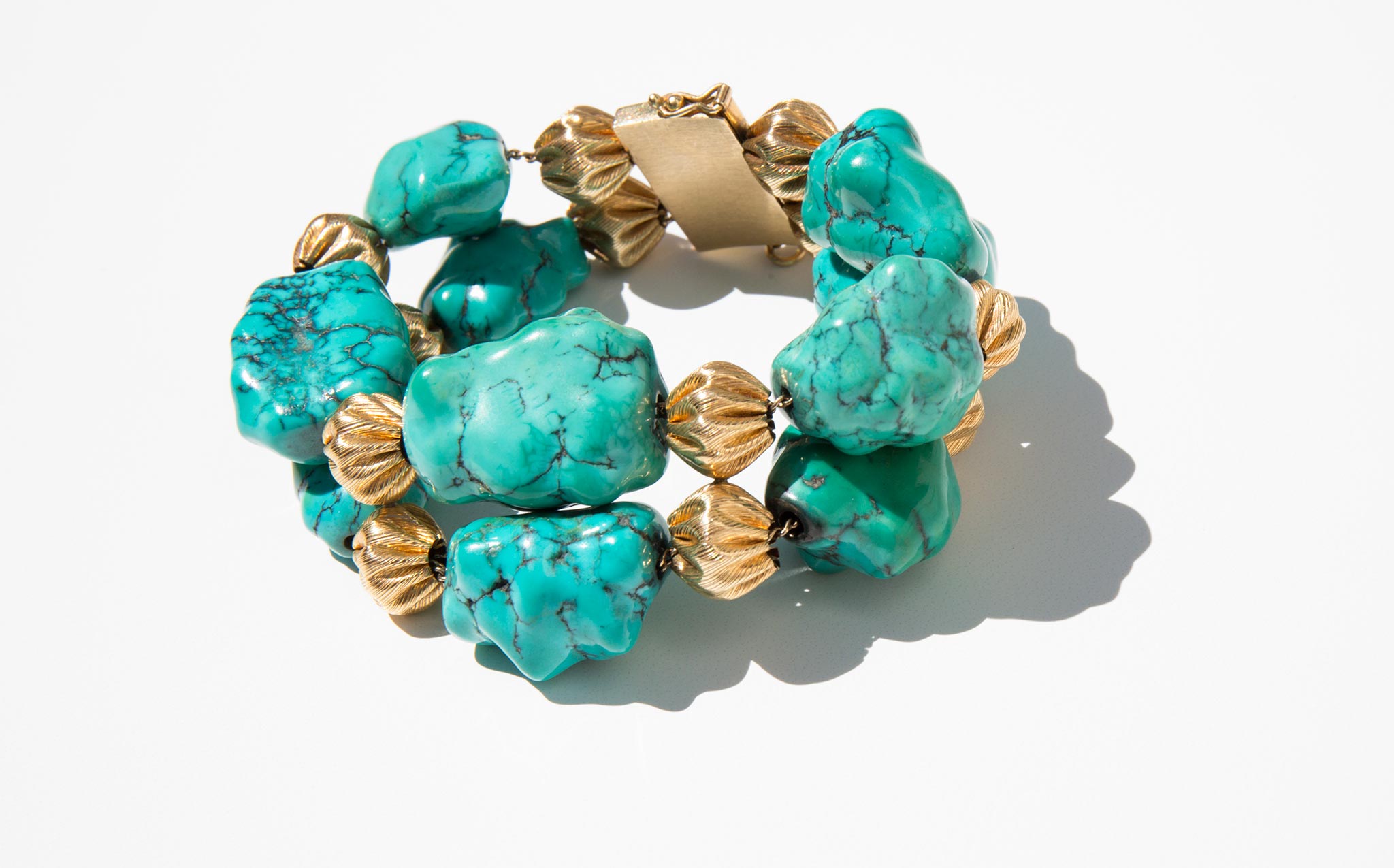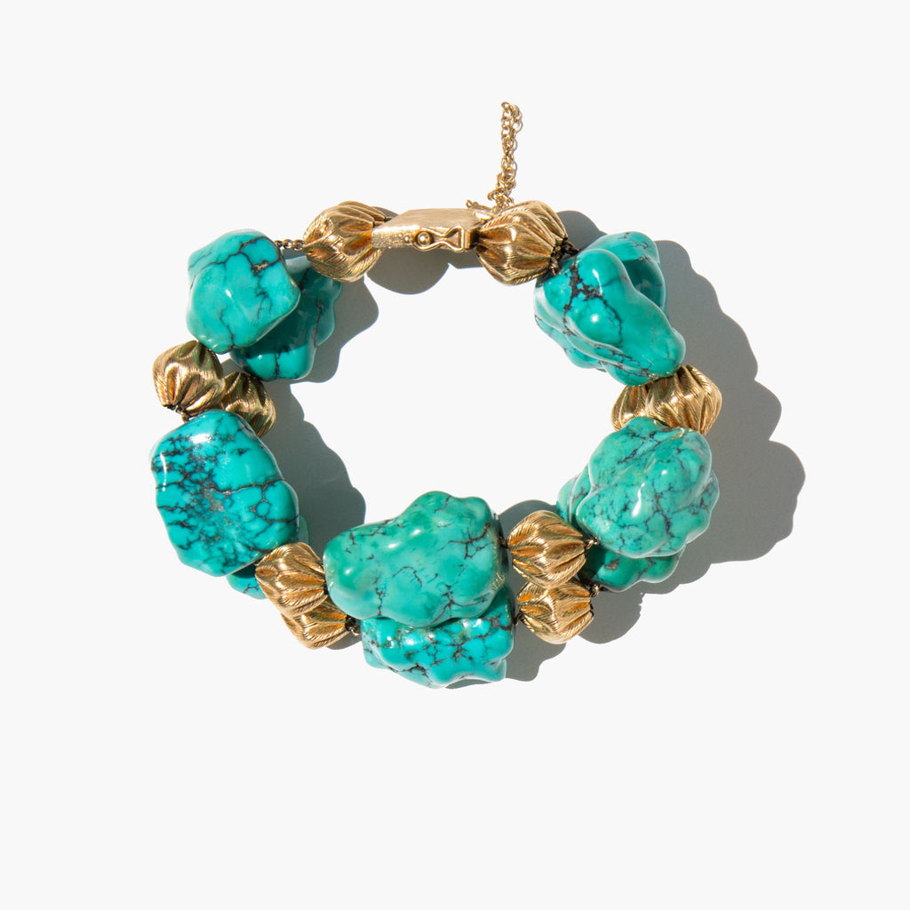 Dazzling gold bead and natural polished turquoise statement bracelet.