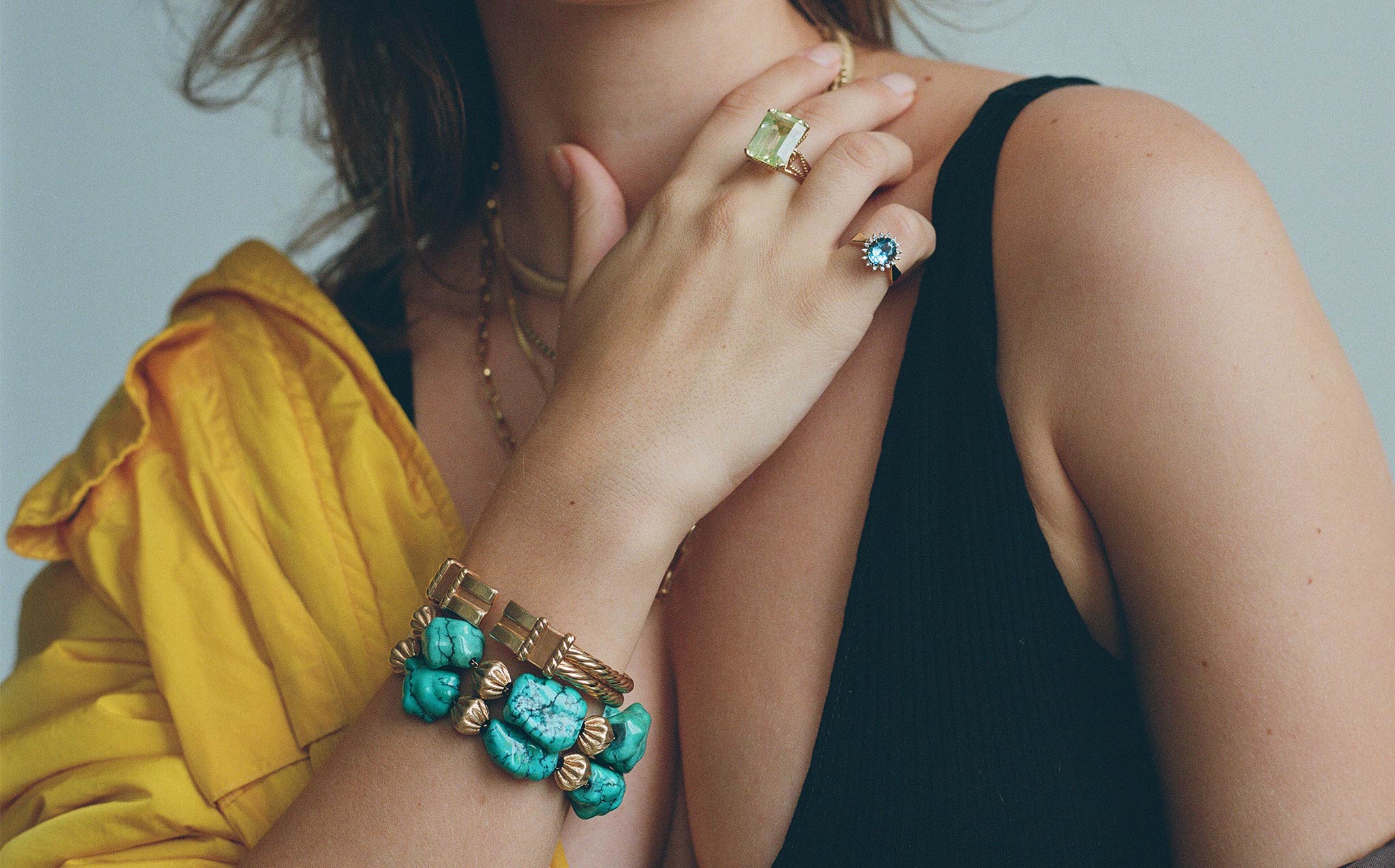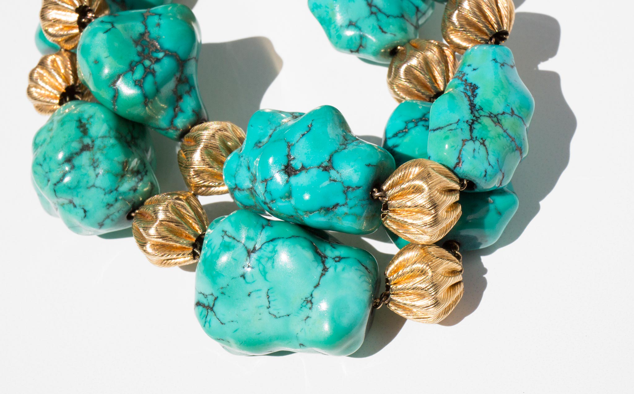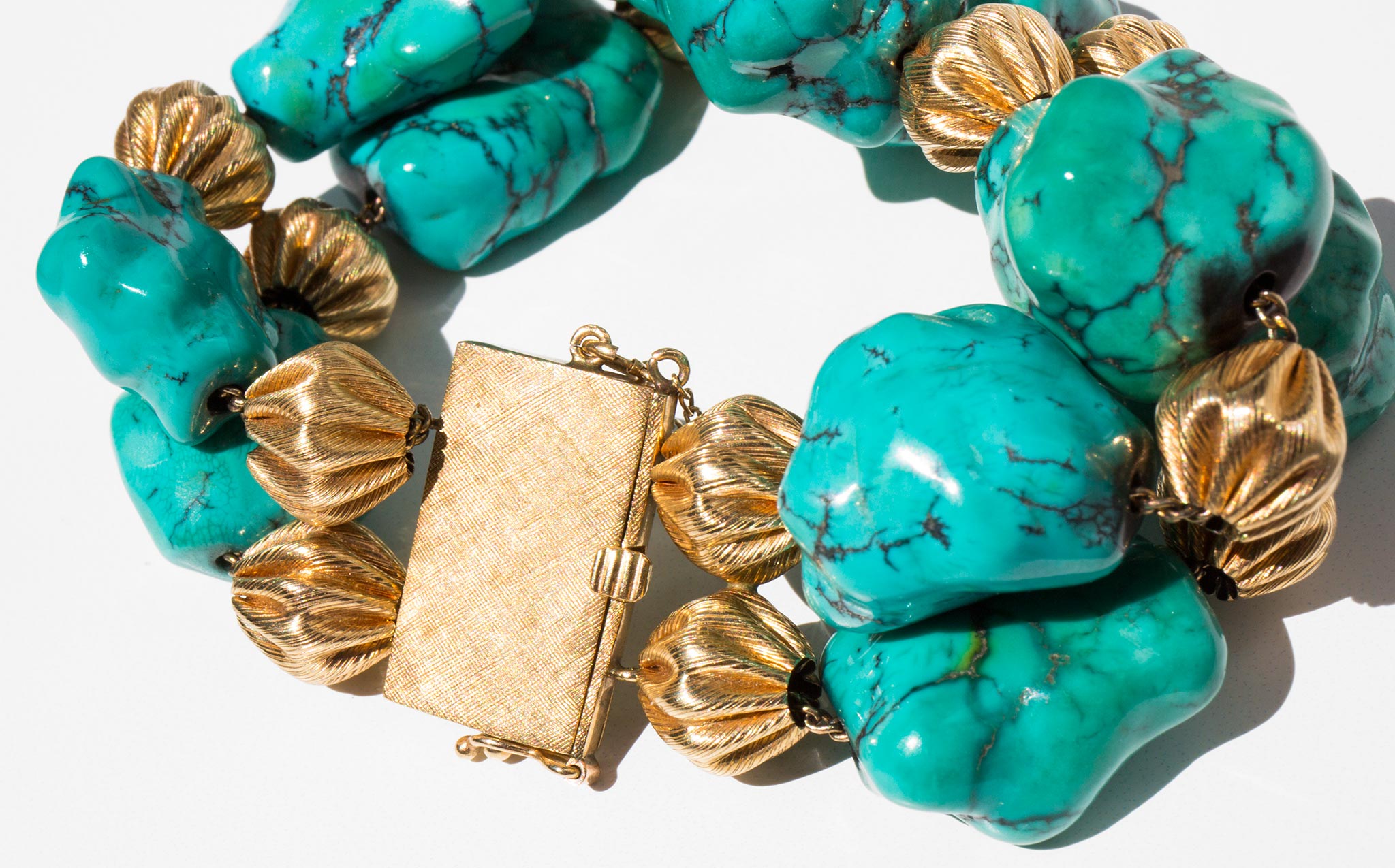 Dazzling gold bead and natural polished turquoise statement bracelet.