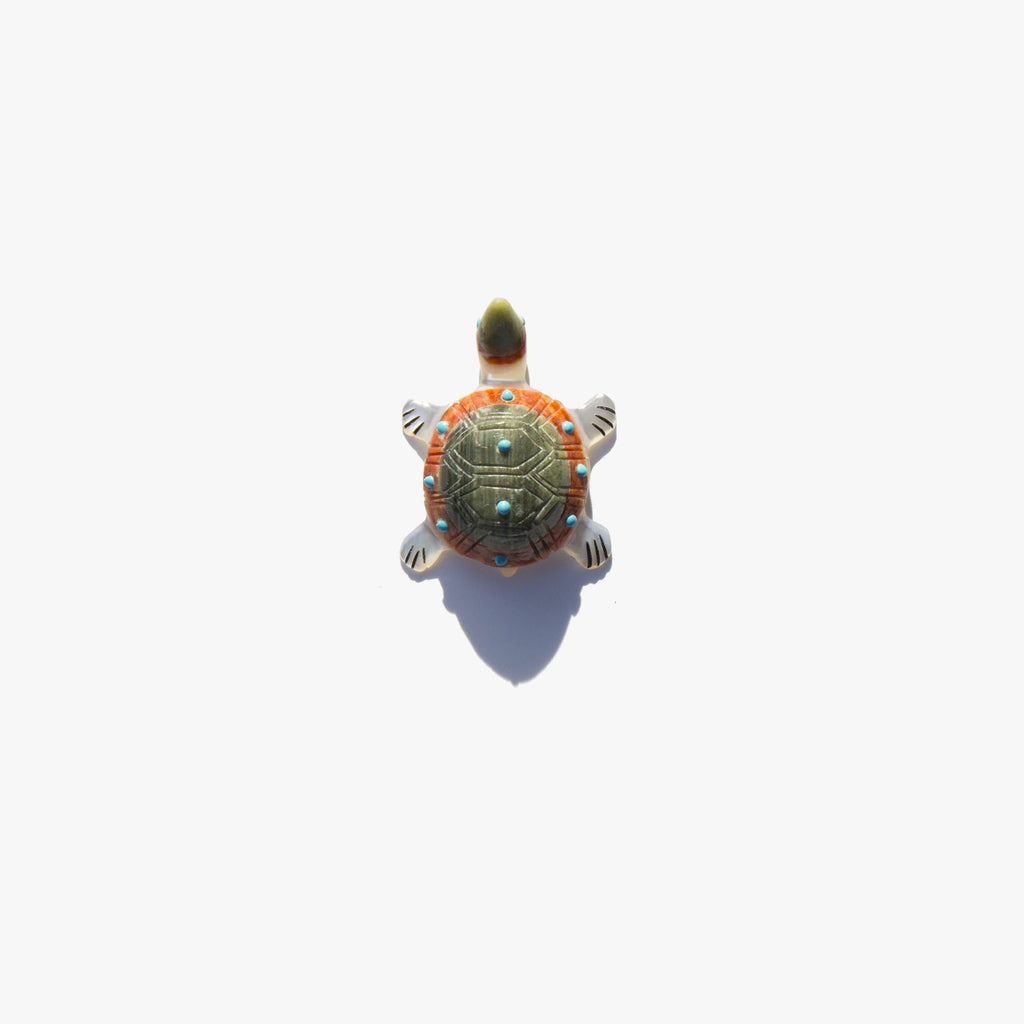 Turtle fetish hand carved by New Mexican artist Andrew Quam. Made with gold lipped mother of pearl, apple coral, ricolite, and inlaid turquoise. Turtles are symbols of Mother Earth and represent longevity, fertility, and reliability.